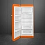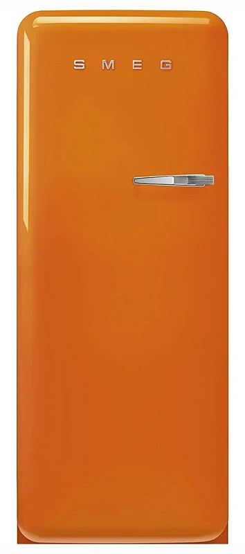 Холодильник Smeg FAB28LOR6 сразу бросается в глаза благодаря своему насыщенному оранжевому цвету и изогнутым ретро-формам – такой дизайн легко станет украшением любой кухни. Модель высотой 153 см и шириной 60,1 см оптимально сочетает компактность с вместительностью, а глубина 72,8 см (с учетом ручки — 76,8 см) важна при установке в нишу. Конструкция с одной дверцей, навешенной с левой стороны, дополняется внешней ручкой в классическом стиле – это удобно и смотрится стильно. За счёт сбалансированных пропорций холодильник гармонично вписывается даже в ограниченное пространство.