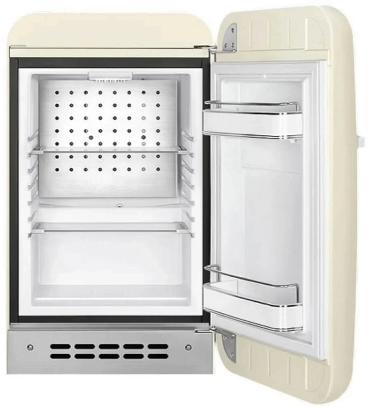 Мини-бар Smeg FAB5LCR6 выполнен в дизайне, вдохновлённом 50-ми годами, и сразу привлекает внимание своим кремовым оттенком и аккуратной ручкой на двери. Его ретро-внешний вид отлично освежит кухонное пространство и будет уместен в интерьере гостиной, рабочего кабинета или отельного номера. Благодаря компактным размерам — 74×40,4×50 см — холодильник удобно разместить в нише, под столешницей или рядом с барной зоной. При этом важно учитывать глубину с учётом ручки — 56,9 см, а также левостороннее открывание двери при планировании места установки. Однодверная конструкция и один отсек охлаждения делают его простым и удобным в использовании.
