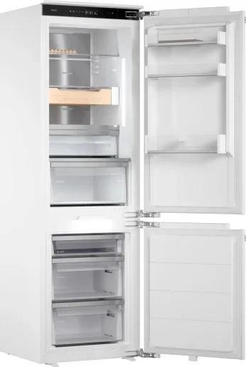 Продуманные детали делают модель максимально удобной: внутренняя LED-подсветка есть во всех зонах; телескопические направляющие упрощают доступ к продуктам; доступны регулировка температуры и опция суперохлаждения напитков. Контроль влажности, качественные материалы и устойчивые настройки делают эту модель надёжным элементом современной кухни.