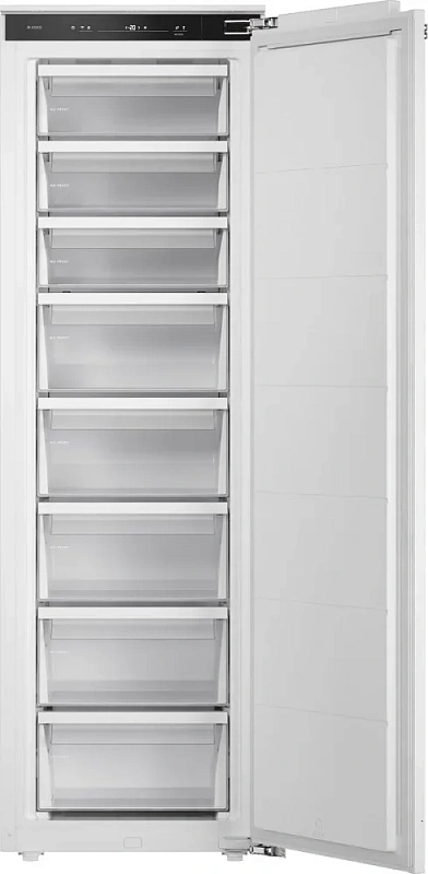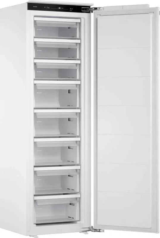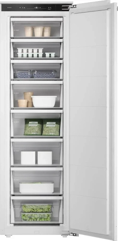 Встраиваемая морозильная камера ASKO RBF276DND1 представляет собой элегантное решение из серии Series 2, которое легко впишется в интерьер — устройство предназначено для установки под мебельный фасад и монтируется по системе door on door. Такое крепление обеспечивает плотное прилегание дверцы морозильника к шкафу и создает аккуратный, цельный внешний вид. Размеры модели составляют 177×55×54 см, а размеры ниши для монтажа — от 177,5 до 178 см в высоту, 56–57 см в ширину и 56 см в глубину, что делает выбор места установки проще. Правая навеска двери и ручка с фирменной гравировкой ASKO подчеркивают удобство использования и брендовый стиль.