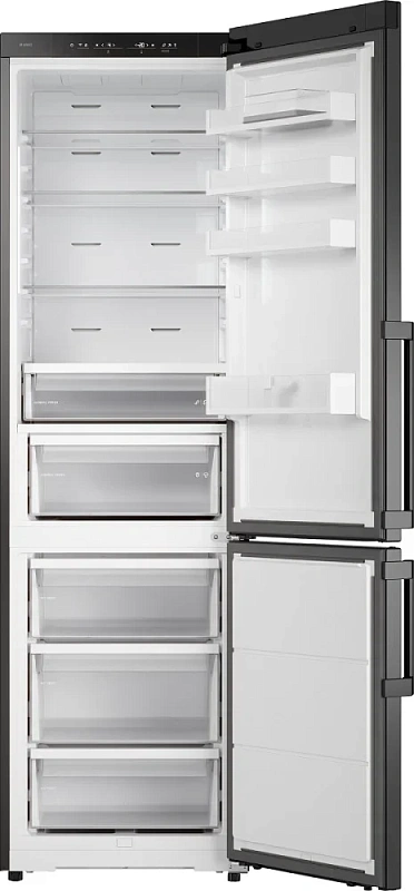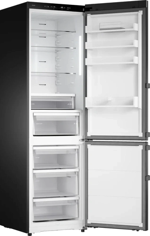 Внутреннее пространство организовано с прицелом на комфорт: три стеклянные полки, четыре полки на дверце, контейнеры зоны свежести Nordic Fresh, а также лоток для яиц в холодильной части; в морозильнике — три выдвижных ящика, форма для льда и технологии No Frost и суперзамораживания, упрощающие уход за техникой. Сенсорное управление с LED-дисплеем позволяет точно регулировать температуру, есть индикация открытой двери (звуковая), а при повышении температуры внутри срабатывает световой+звуковой сигнал. Также предусмотрены дополнительные функции: режимы Шаббат, Вечеринка, Очистка, адаптация под влажность и контроль температуры. Устройство поддерживает подключение к приложению ConnectLife для удалённого управления.
