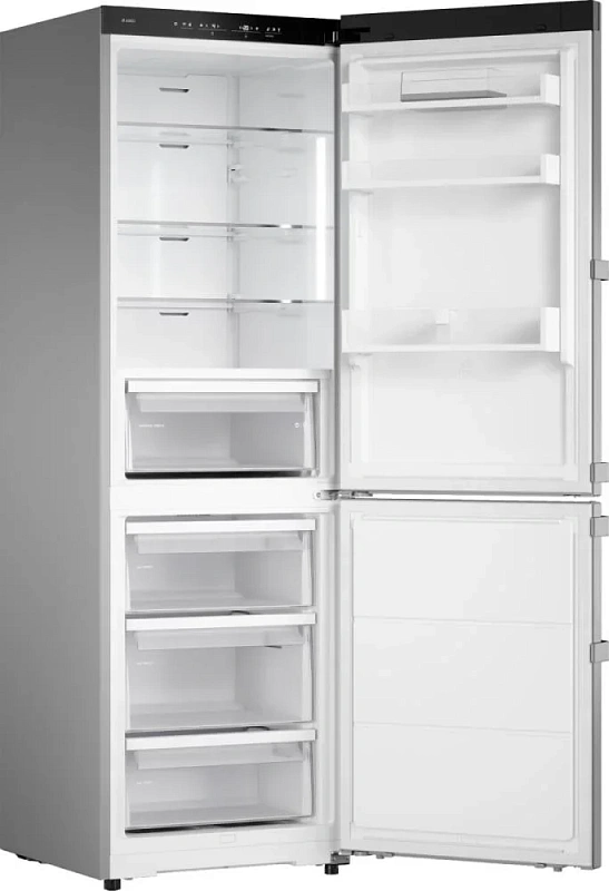 Модель оснащена двумя камерами с нижним расположением морозильника — это универсально и практично. Общий полезный объём составляет 306 литров из 357 литров общей емкости: холодильная камера вмещает 200 литров, а морозилка — 106 л с тремя вместительными ящиками, лотком для льда и функцией суперзаморозки до 10 кг/сутки. При отключении электроэнергии сохраняет холод до 14 часов. Работает на инверторном компрессоре с хладагентом R600A и системой циркуляции воздуха, что позволяет экономно расходовать энергию (A++), потребляя всего 295 кВт·ч в год, при этом уровень шума не превышает комфортные 34 дБ.