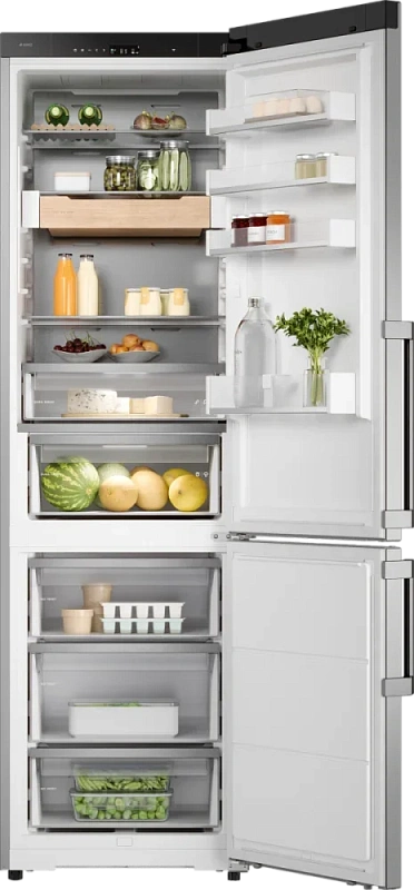 Внутреннее пространство организовано с умом: основная камера включает четыре стеклянные полки, дверца — четыре отдельных отсека, а также в комплекте идут подставка под яйца, держатель для бутылок и две зоны свежести DuraFresh™ с LED-подсветкой — идеальное решение для хранения мяса и овощей. Телескопические направляющие обеспечивают простой доступ к продуктам. Имеются режимы быстрой заморозки и охлаждения.
