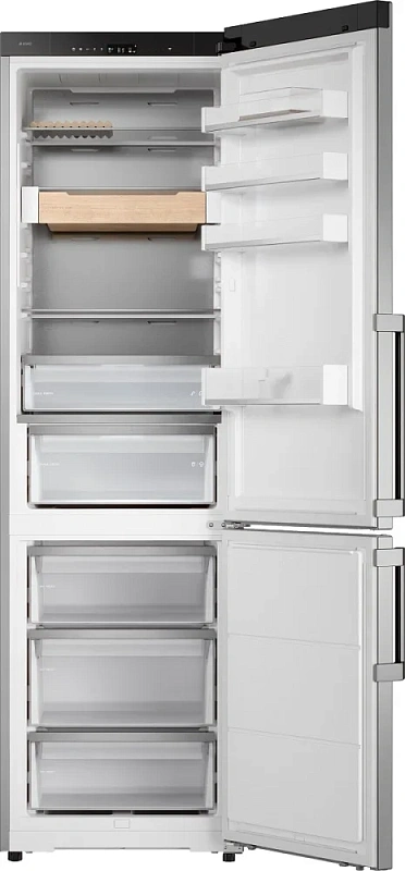 Холодильник ASKO RFC526RNBS1 — это модель высокого класса, сочетающая лаконичный дизайн из нержавеющей стали с технически продуманным наполнением для удобного и эффективного хранения продуктов. Его габариты 203×59×65 см позволяют разместить внушительный объём в 442 литра, из которых полезный составляет 388 литров: холодильная часть — 295 л (из них используется 267 л), морозильная — 147 л (полезный объём 121 л), оборудованная тремя выдвижными контейнерами. Морозильное отделение находится снизу, работает по технологии No Frost, справляется с замораживанием до 13 кг в сутки и сохраняет холод автономно до 13 часов.