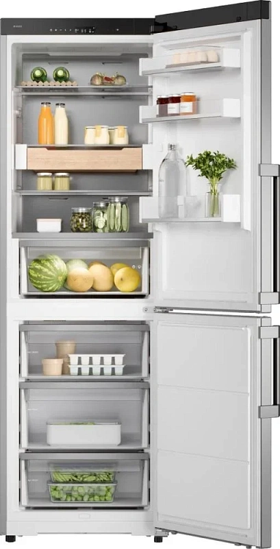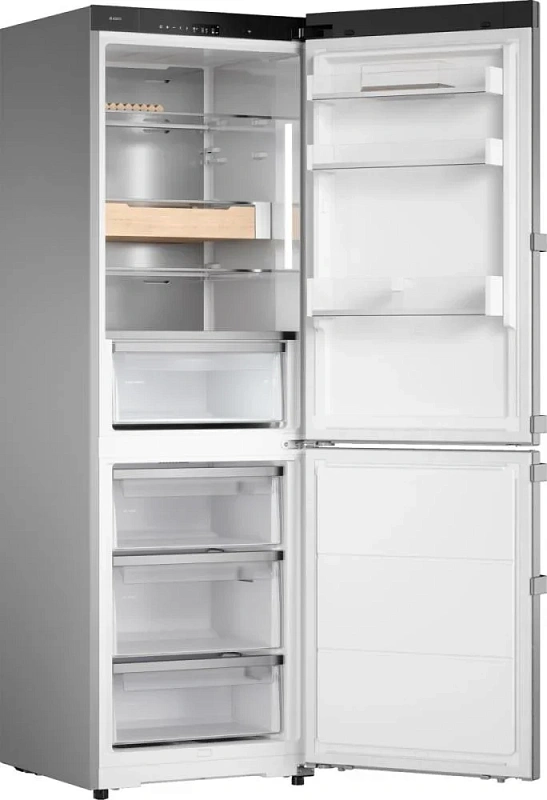 Внутри всё организовано для удобства пользования: четыре полки из стекла, три дверные полки, держатель для яиц и стойка для бутылок входят в комплект. Зона свежести DuraFresh™ освещается LED-подсветкой и оснащена контейнером с контролем влажности. Морозильное отделение содержит три выдвижных ящика, функцию быстрой заморозки, лоток для льда и систему No Frost, избавляющую от необходимости размораживания вручную.
