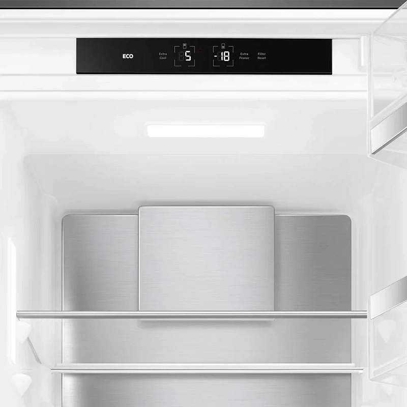 Дизайн тоже заслуживает внимания — корпус предназначен для установки под мебельную панель (в комплект она не входит), что позволяет органично вписать холодильник в интерьер. Управление здесь электронное, так что регулировать температуру не составит труда.