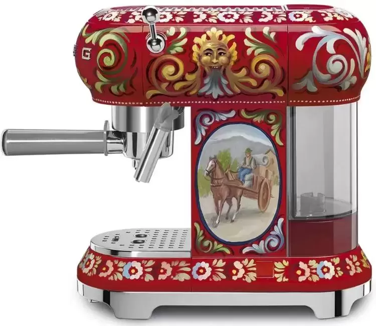 Эспрессо-кофемашина Smeg в дизайне Dolce&Gabbana создана для тех, кто ценит не только вкус кофе, но и изысканный внешний вид. Эта компактная модель с термоблоком быстро нагревается, даёт возможность выбирать объём порции и готовить разные виды кофе. В комплекте фильтры как для одной, так и для двух чашек. Подходит как для молотого кофе, так и для порционных капсул формата Paper Pods.