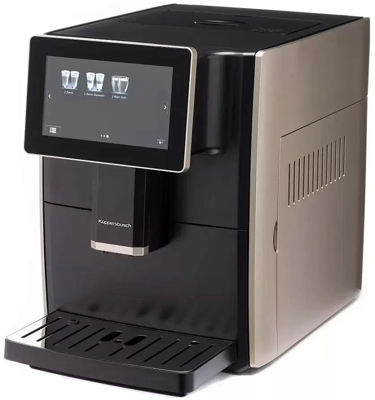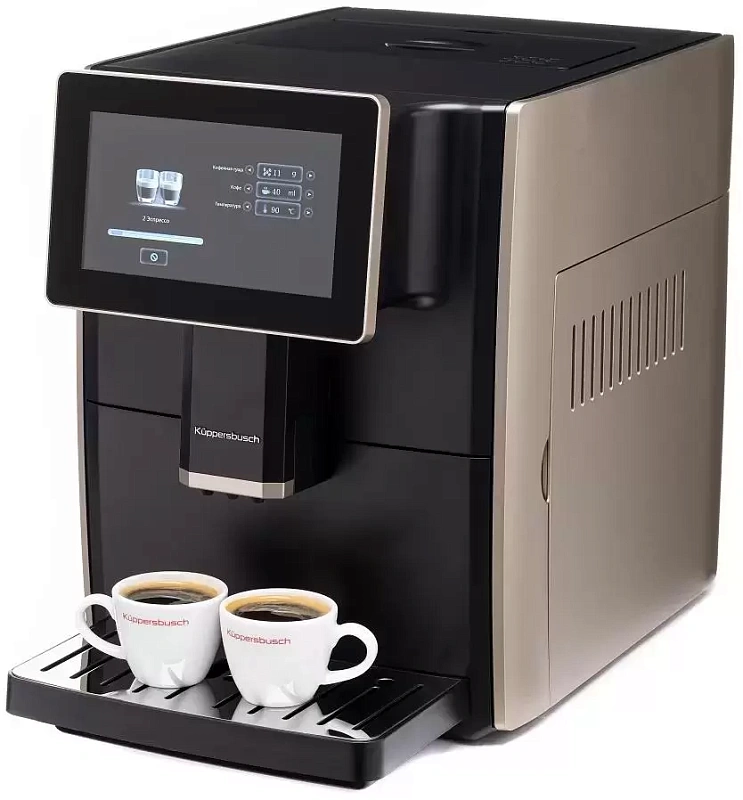 Кофемашина Kuppersbusch станет отличным помощником в приготовлении привычных напитков и смелых кофейных экспериментов. Её корпус выполнен в элегантном золотистом оттенке, который легко вписывается и в классический, и в современный интерьер. Бак для воды размещён сзади, так что при установке лучше оставить немного свободного места для удобства доступа. Управление максимально простое — справится даже тот, кто раньше не имел дела с подобной техникой. Сенсорный экран с интуитивно понятным интерфейсом позволяет без труда выбрать нужный вариант кофе и настроить температуру или крепость по вкусу. В списке доступных напитков — эспрессо, американо, капучино, латте, маккиато, флэт уайт и другие популярные разновидности. Чтобы техника оставалась в порядке как можно дольше, в ней предусмотрены автоматические режимы очистки: от накипи и промывка после включения — всё это упрощает уход и продлевает срок службы устройства.