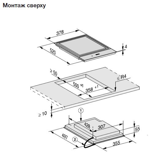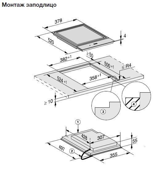 - Внешние размеры выреза в мм (ширина) для встраивания заподлицо: 382