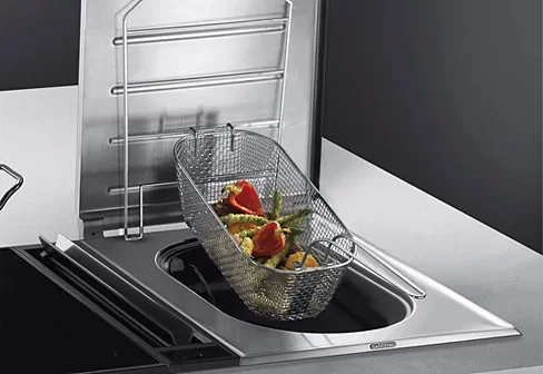 Комби-панель Gaggenau VF 411-110 станет отличным выбором для тех, кто любит готовить и при этом старается не тратить лишнее время. Модель оснащена встроенной электрической фритюрницей, с которой приготовление обычно «долгих» блюд становится проще. Особенность конструкции — зона «холодного масла», благодаря которой жир частично очищается прямо во время готовки, сохраняя свежесть на дольше. Панель позволяет одновременно использовать сразу две корзины для жарки, а предусмотренная функция плавного растапливания жира делает процесс приготовления удобнее. Эмалированные решетки смотрятся стильно и практичны, а наличие защиты от включения детьми делает устройство безопасным. Сдержанный дизайн панели легко дополнит современную кухню.
