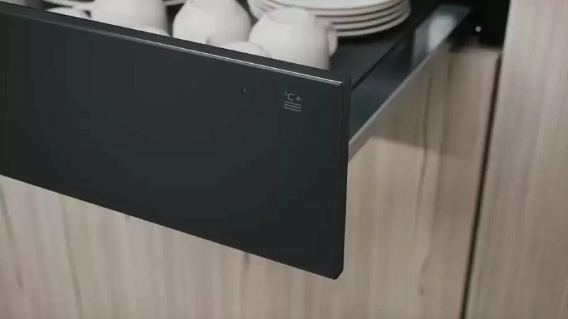 Управление осуществляется через удобные поворотные ручки, а наличие индикатора включения помогает следить за работой устройства. Телескопические направляющие обеспечивают плавное выдвижение ящика, а поверхность внутри — нескользящая для устойчивости предметов.