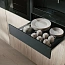 Открывается дверца нажатием на определённую область передней панели, что делает модель удобной для современных минималистичных кухонь с гладким фасадом. Внутренняя часть выполнена из нержавейки, а входящие в комплект телескопические направляющие облегчают использование и делают его более безопасным.