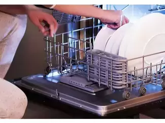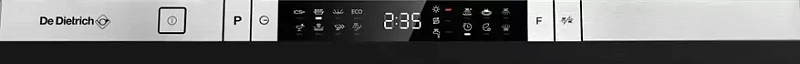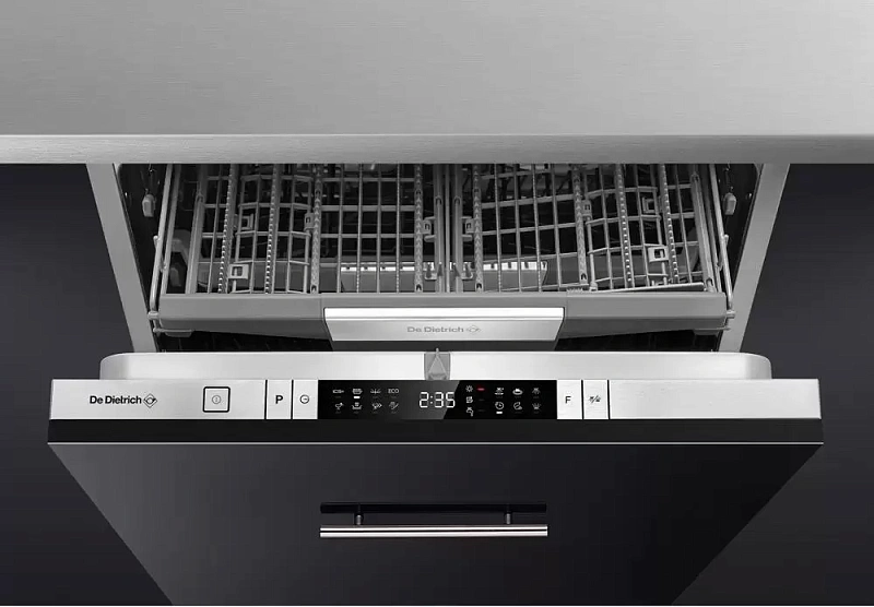 Встраиваемая посудомоечная машина De Dietrich легко впишется в любой интерьер — главное, правильно подобрать место с подведёнными коммуникациями. Устанавливается она полностью в нишу и закрывается декоративной панелью. Имейте в виду: фасадная панель не входит в комплект поставки, её потребуется установить отдельно. Габариты у модели стандартные, так что на совсем маленькой кухне она может просто не поместиться. Загрузка рассчитана на 15 комплектов посуды — это стандартный набор для одного человека, включающий глубокую и плоскую тарелки, салатную тарелку, чашку с блюдцем, ложку и вилку.