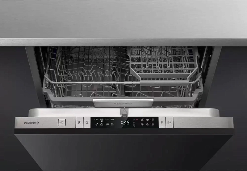 Встраиваемая модель De Dietrich органично впишется в любой интерьер — главное, грамотно подобрать место установки, чтобы было удобно подключить все коммуникации. Устанавливается полностью в специальную нишу и закрывается декоративной панелью. Учтите: фасадная панель в комплект не входит, её нужно будет установить самостоятельно. Габариты у машины стандартные, поэтому на совсем маленькой кухне может просто не хватить под неё места. Вместимость — до 14 комплектов посуды. Один комплект — это посуда на одного человека: плоская тарелка, глубокая тарелка, салатник, чашка с блюдцем, ложка и вилка.