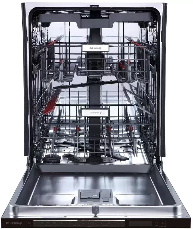 Встраиваемая посудомоечная машина De Dietrich DCJ632DQB — это удачное сочетание стиля, практичности и удобства для современных кухонь. Модель полноразмерная и полностью скрывается за мебельным фасадом, не нарушая общее оформление интерьера. Габариты устройства составляют 85,7 × 59,8 × 55 см, а ниша под установку должна быть размером 86 × 60 × 58 см — благодаря этому машина встраивается плотно и ровно, без щелей.