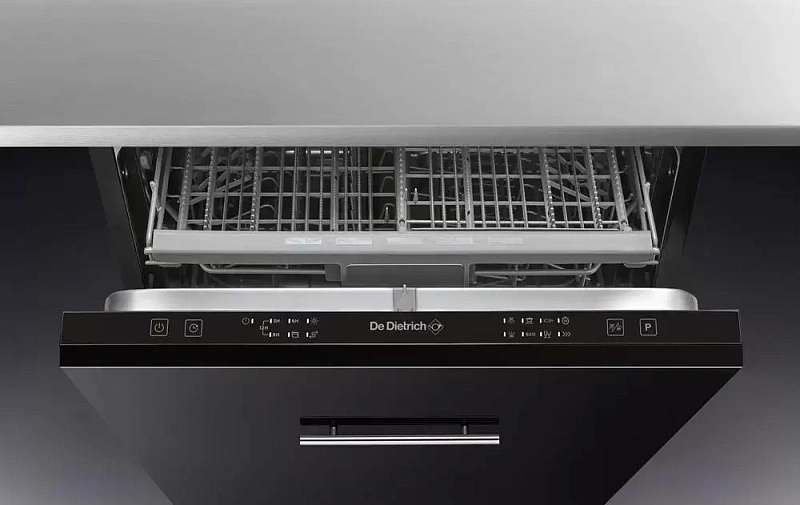 Встраиваемая посудомоечная машина De Dietrich легко впишется в любой интерьер — главное, заранее выбрать подходящее место и подвести коммуникации. Она полностью устанавливается в нишу и скрывается за декоративной панелью. Обратите внимание: фасад в комплекте отсутствует, его нужно будет установить отдельно. Габариты модели стандартные, поэтому она может не подойти для совсем компактных кухонь. Одновременно можно загрузить до 14 комплектов посуды. Один комплект — это набор предметов, рассчитанный на одного человека: глубокая и плоская тарелки, салатная тарелка, чашка с блюдцем, вилка и ложка.
