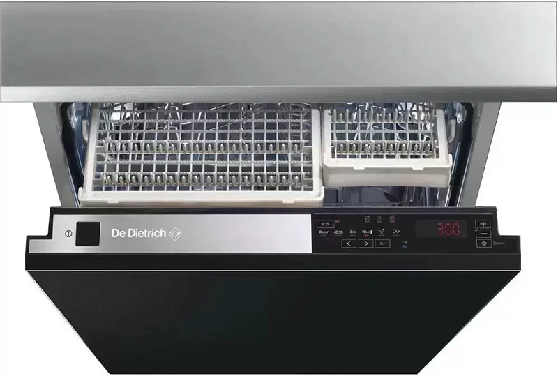 Встраиваемая посудомоечная машина De Dietrich DVH 1054 J рассчитана на 14 комплектов и оснащена турбосушкой. В арсенале устройства – 7 уровней температур и столько же стандартных программ, благодаря чему легко подобрать нужный режим в зависимости от загрязнённости посуды. Специальное пространство под названием «Mezzanine» предназначено для отдельной мойки столовых приборов — это действительно удобно.