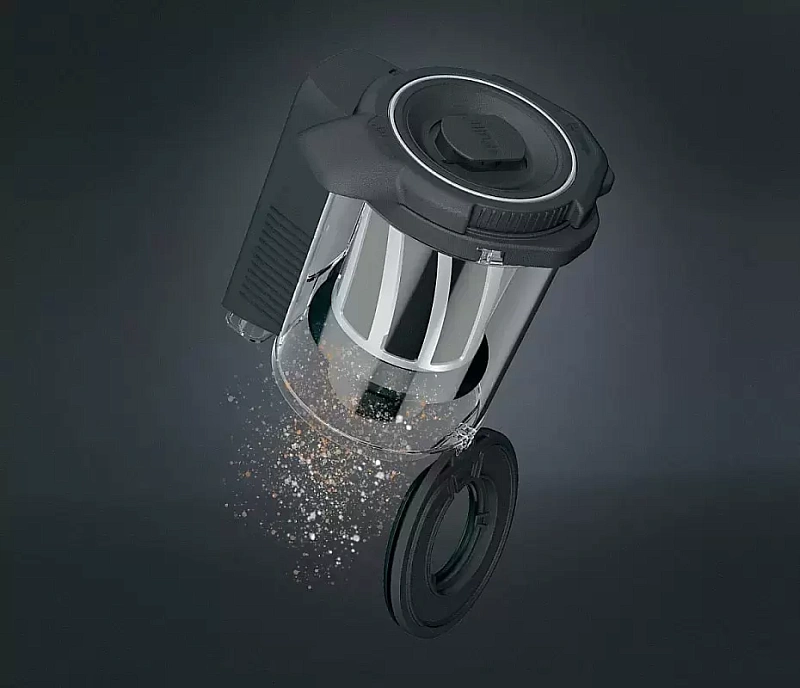 Пылесборник выполнен в виде пластикового контейнера объёмом 0,5 л и снабжён системой Twist2open, позволяющей открыть его одним нажатием кнопки. Управление мощностью расположено на рукоятке — предусмотрено три уровня, а световой дисплей отображает текущие настройки. Кроме того, есть индикаторы, которые сообщают, когда пора очистить контейнер или заменить фильтр.