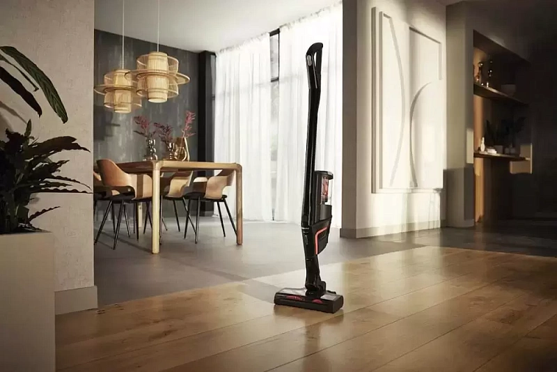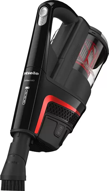 Вертикальный пылесос Miele SMUL1 Triflex HX1 Obsidian Black VC сочетает в себе высокую мощность и удобство эксплуатации. Удлинённая ручка с насадкой позволяет убирать, не наклоняясь лишний раз, а компактные габариты делают его хранение проще и удобнее. Модель предназначена для сухой уборки — оптимальный вариант для большинства пользователей. Сильный воздушный поток легко справляется с пылью, шерстью животных и даже с крупными частицами мусора. Пылесборник объёмом 0,5 литра выполнен в виде контейнера — его можно быстро опустошить и при необходимости промыть. Встроенный Hygiene Lifetime фильтр задерживает мелкие частицы грязи, улучшая качество воздуха в помещении. Уровень всасывания легко регулируется с помощью переключателей на ручке, а специальный дисплей показывает текущий режим работы. Устройство питается от аккумулятора, поэтому можно свободно перемещаться с ним по дому без ограничений, связанных с проводами или розетками. Для хранения предусмотрена удобная парковочная система — пылесос занимает минимум пространства. Технология шумоподавления делает его работу менее заметной, что особенно важно для семей с детьми или жильцов домов с тонкими стенами. Насадка крепится к корпусу через сплошную удлинённую трубку, благодаря чему уборка остаётся эффективной и комфортной.