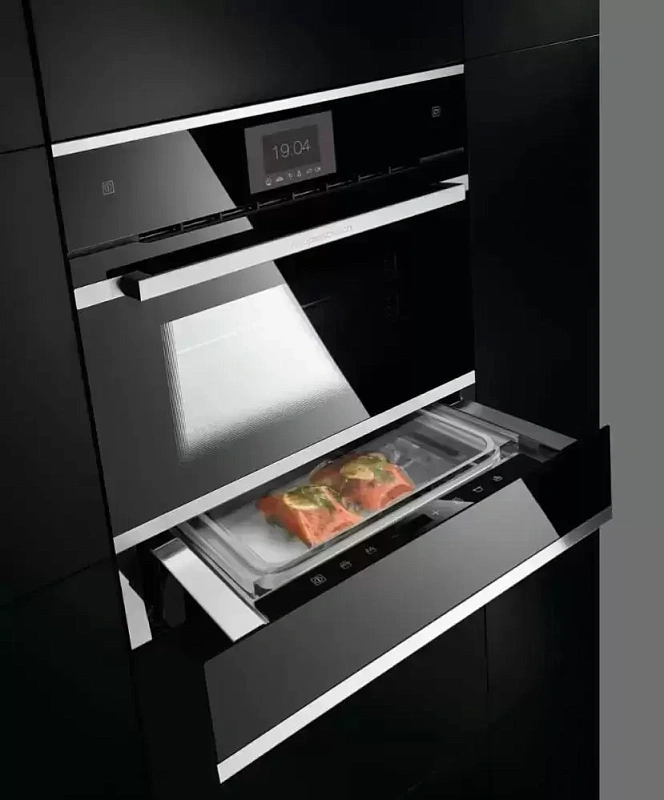 Встраиваемый вакууматор Kuppersbusch CSV 6800.0 S позволяет значительно продлить срок хранения продуктов, удаляя воздух из упаковки. Это особенно важно для сохранения вкуса, аромата и текстуры пищи — всё остаётся практически без изменений. Устройство компактное: его высота составляет всего 14 см, а ширина — 60 см, благодаря чему модель легко разместить в колонне рядом с другой кухонной техникой.