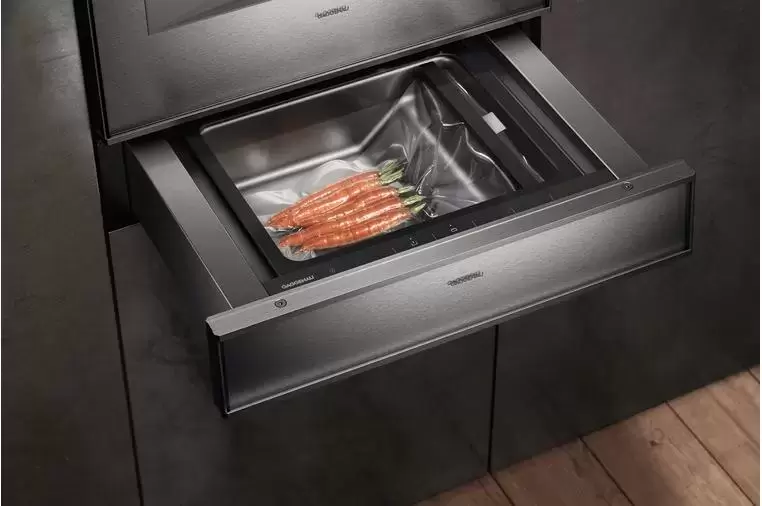 Вакууматор «Гаггенау» совместим и с пакетами, и с контейнерами — предусмотрен внешний разъём для подключения. С его помощью можно плотно упаковывать как твёрдые, так и жидкие продукты, использовать его для маринования и подготовки блюд в режиме Sous-Vide. Установить устройство можно по-разному: либо поместить в отдельную нишу, либо разместить под духовым шкафом — всё зависит от особенностей кухни и предпочтений владельца. Камера выполнена из нержавеющей стали, что обеспечивает надёжность и продолжительный срок службы. Передняя панель — стеклянная, антрацитового оттенка; чтобы открыть вакууматор, достаточно надавить на нижнюю часть панели.