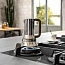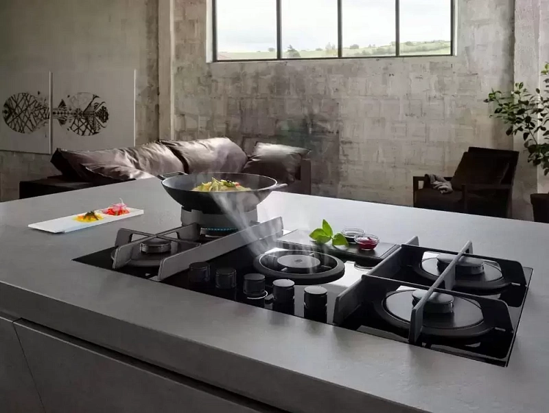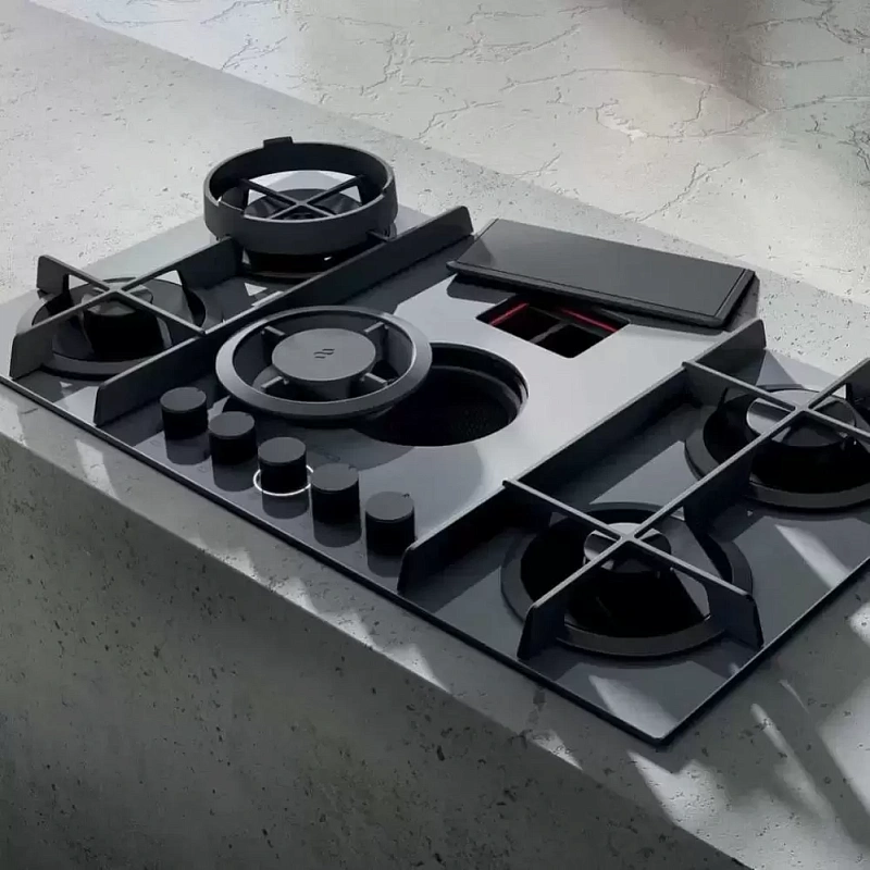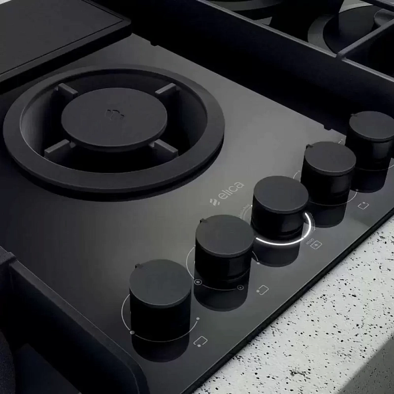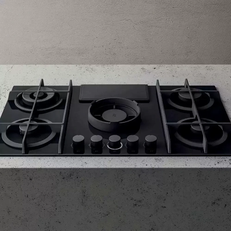 Газовая варочная панель подключена к вытяжке, которая убирает пар и загрязнённый воздух во время приготовления пищи. Поверхность из стеклокерамики оснащена четырьмя горелками и дополнительной зоной нагрева. Для этой зоны можно отдельно приобрести подставку WOK. Одна из конфорок оснащена двумя рядами пламени, что позволяет регулировать мощность нагрева. Все горелки накрыты прочными чугунными решётками.