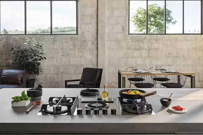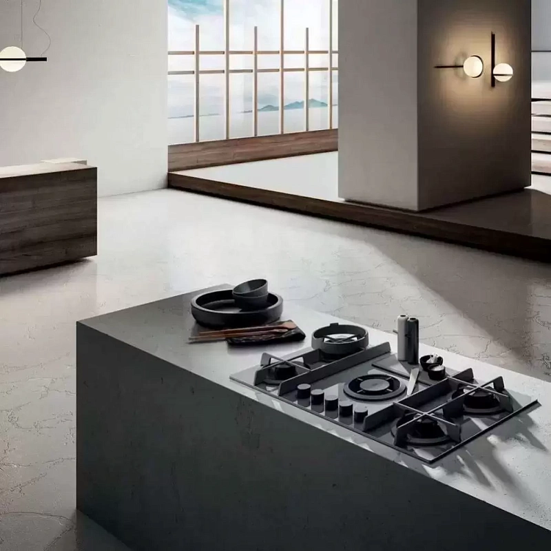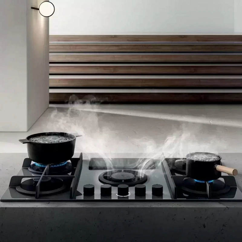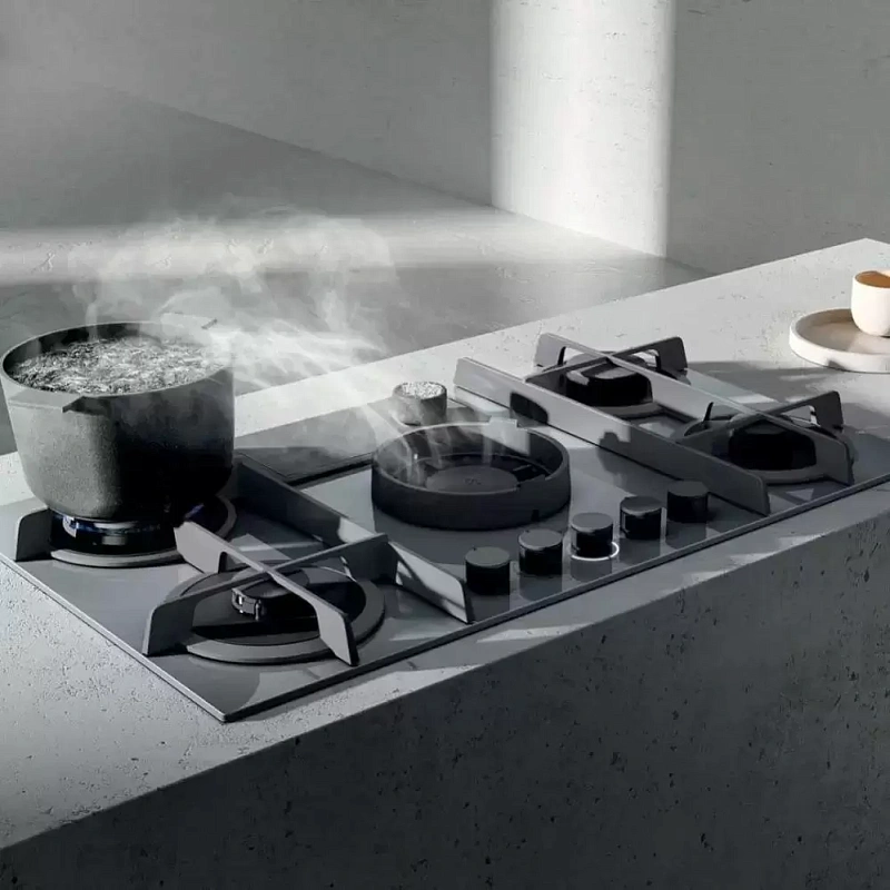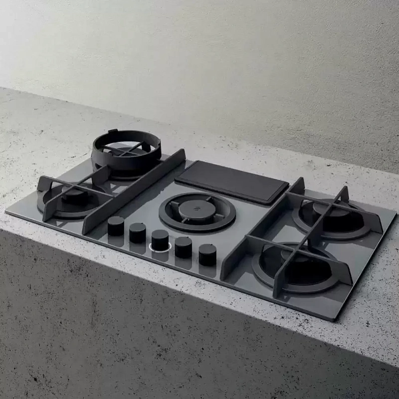 Газовая варочная панель выполнена из серой стеклокерамики, а чугунные решётки надёжно закрывают горелки. Она подключена к вытяжке, которая удаляет пар и загрязнённый воздух во время приготовления пищи. В комплект входит алюминиевый фильтр для улавливания жира. При необходимости можно отдельно приобрести подставку для WOK, чтобы пользоваться дополнительной зоной нагрева.