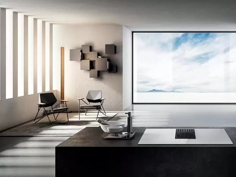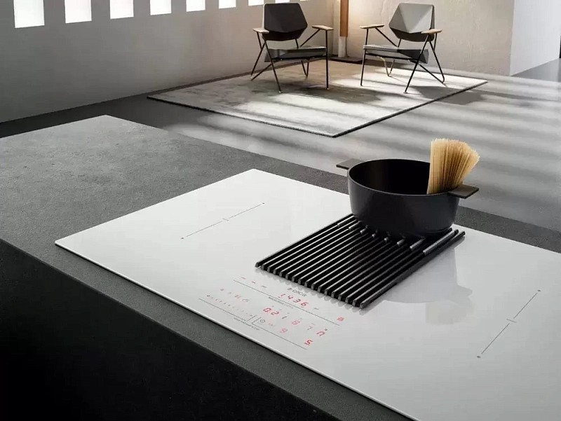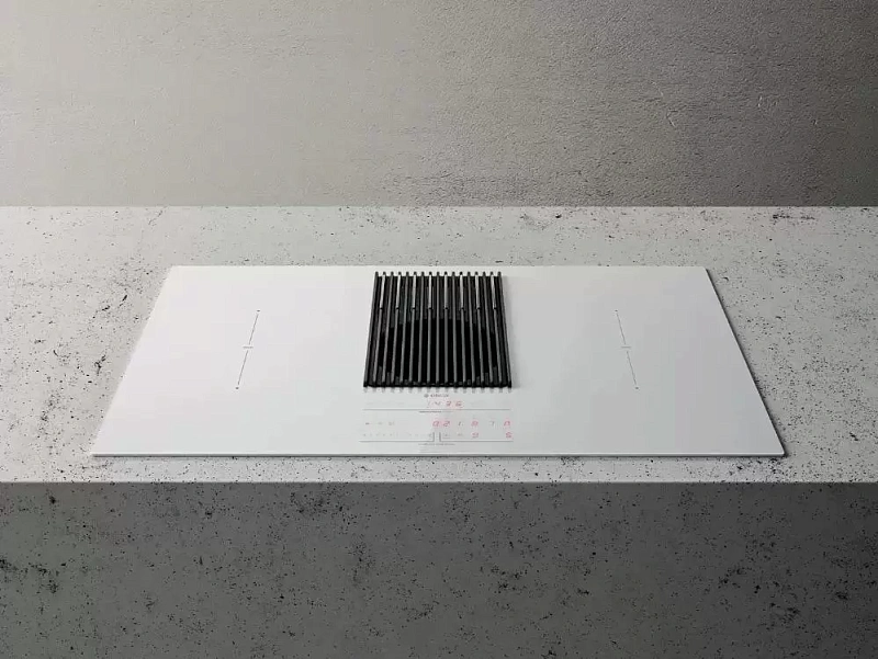 Индукционная плита с белоснежной стеклокерамической поверхностью, созданная по дизайну FABRIZIO CRISÀ, получила множество наград за свой внешний вид. Встроенные весы можно использовать как во время готовки, так и отдельно — без включения конфорок. Вытяжка встроена прямо в панель, работает в режиме отвода воздуха; при желании можно установить дополнительный угольный фильтр.