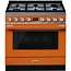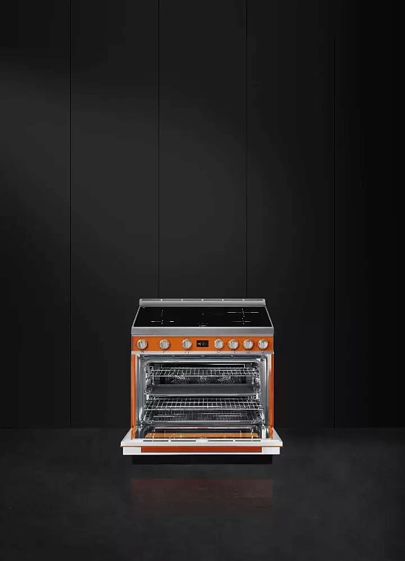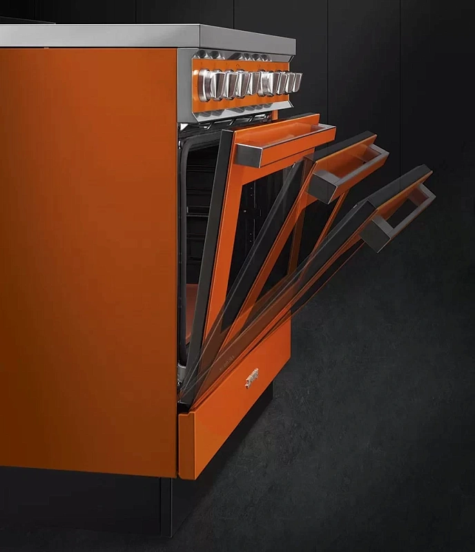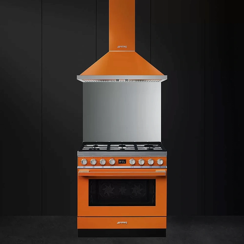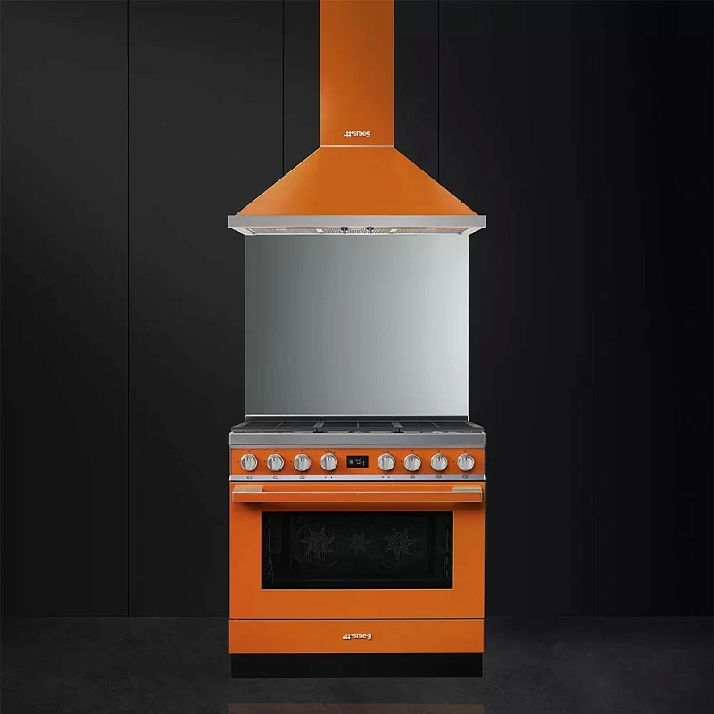 Этот отдельно стоящий прибор (ширина 90 см) можно устанавливать рядом с другой бытовой техникой — встроенная тангенциальная система охлаждения обеспечивает безопасность. Газовая варочная поверхность оснащена шестью конфорками и системой электроподжига. В духовом шкафу предусмотрено девять программ приготовления, включая режимы с грилем и конвекцией.
