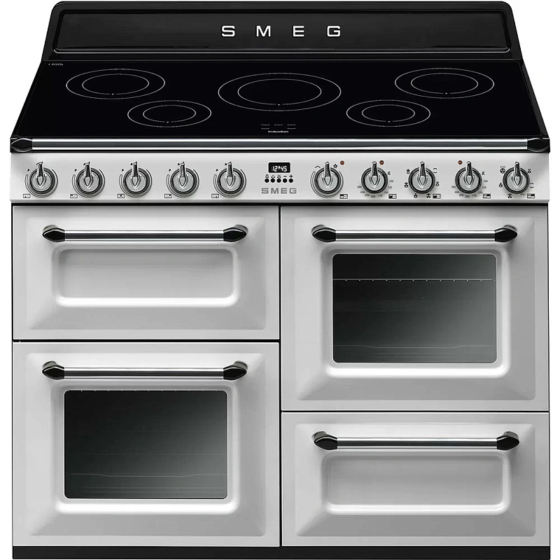 Отдельностоящий варочный центр серии Victoria от Smeg, оснащённый тремя духовками. Все три духовки снабжены тангенциальной системой охлаждения и внутренним освещением. Варочная панель включает пять индукционных конфорок с отображением активной зоны нагрева.