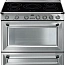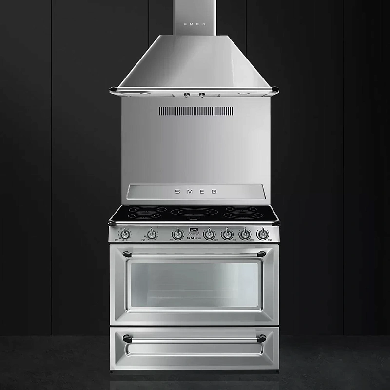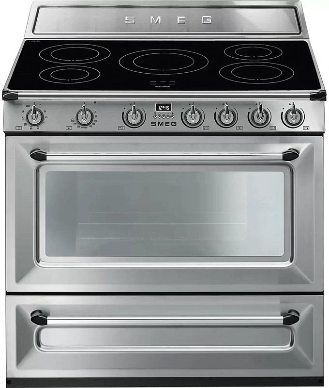 Многофункциональный отдельно стоящий варочный центр Smeg выполнен в цвете нержавеющей стали. Боковые панели — матово-чёрные. В нижней части предусмотрен выдвижной ящик для хранения, а дверца духовки оснащена петлями Soft Close для мягкого и плавного закрытия.