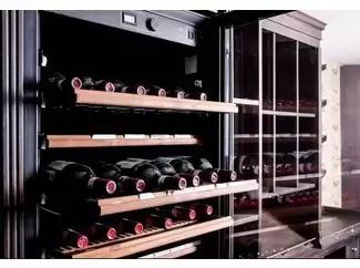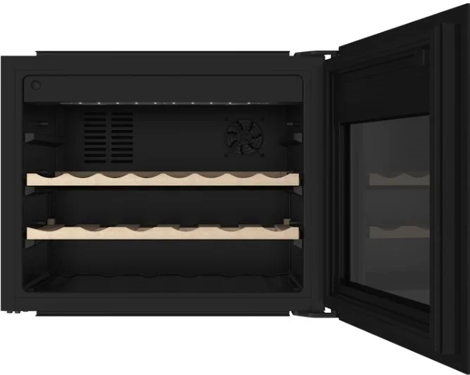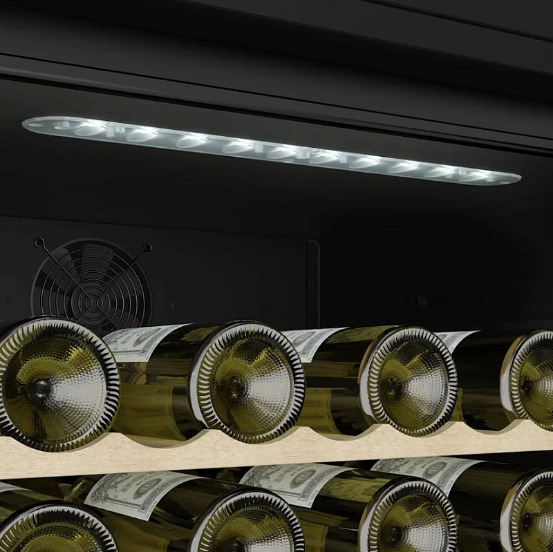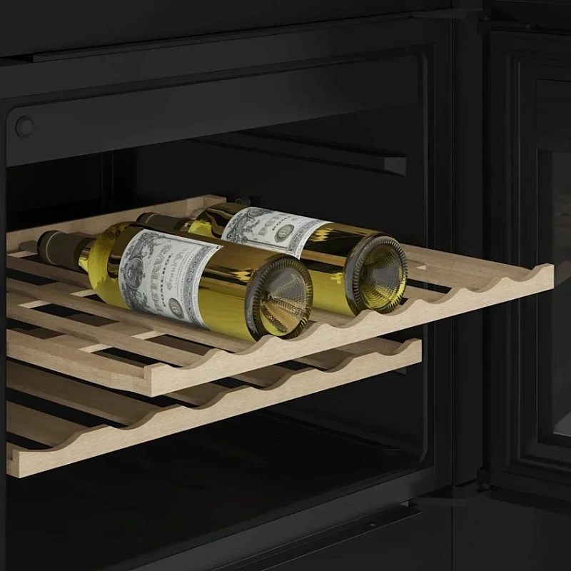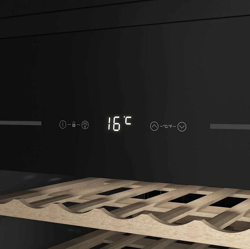 Управление осуществляется через электронную панель — разобраться в настройках можно быстро, интерфейс интуитивен. На дисплее отображаются показания встроенных датчиков, а цифровой термометр помогает следить за соблюдением нужной температуры. Внутреннее освещение подчёркивает коллекцию бутылок, которых можно разместить на двух полках. Также предусмотрена вентиляция камеры, позволяющая избежать появления затхлого воздуха и посторонних запахов.