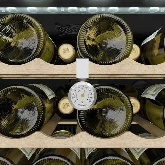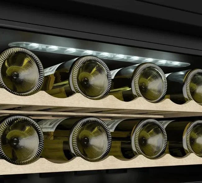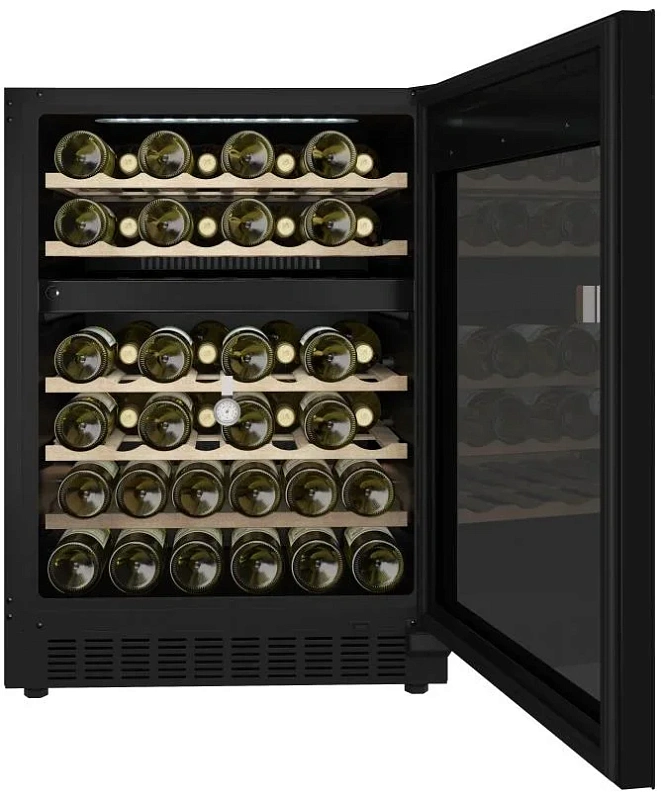 Электронная система управления даёт возможность быстро освоиться в настройках устройства и установить нужные параметры. Информация от датчиков внутри камеры отображается на дисплее, а встроенный цифровой термометр помогает следить за соблюдением заданных условий хранения. Внутренняя подсветка — благодаря установленным лампочкам — хорошо освещает содержимое шкафа. Всего предусмотрено пять полок для размещения бутылок. Вентиляция внутри организована таким образом, чтобы обеспечивать циркуляцию воздуха и не допускать появления посторонних запахов.