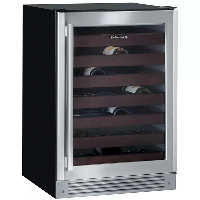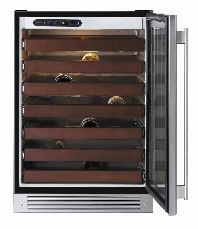 Винный шкаф De Dietrich DWS 860 X отлично подойдёт для аккуратного хранения небольшой винной коллекции. На семи выдвижных деревянных полках можно разместить до 57 бутылок объёмом по 0,75 литра. Температурный диапазон от 5 до 15 °C даёт возможность установить подходящий режим для разных видов вин. Управление осуществляется через сенсорную панель с подсвечиваемым LCD-дисплеем.
