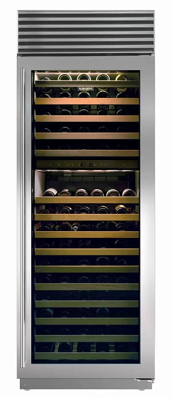 Модель винного холодильника SUB-ZERO ICBBW-30 рассчитана на хранение до 147 бутылок объёмом 0,75 л и оборудована двумя независимыми температурными зонами. Это удобно, если вы хотите держать разные сорта вина при подходящих для них условиях. Холодильник устанавливается отдельно, поэтому его можно разместить в погребе или хозяйственном помещении. Температура в пределах от 4 до 18 °C регулируется отдельно для каждой из двух камер — это особенно ценно, если вы одновременно храните белые и красные вина. Внутри установлено 14 полок, позволяющих разместить бутылки аккуратно и без лишнего нагромождения. Дверца выполнена из стекла со специальным УФ-фильтром, который бережёт вино от вредного света, а заодно придаёт внешнему виду устройства изысканность. Корпус сделан из нержавеющей стали. Управление осуществляется с помощью электронной панели: настройки просты и понятны. На дисплее отображаются данные с датчиков внутри камер, а цифровой термометр помогает следить за температурой. Встроенная подсветка делает содержимое холодильника хорошо различимым даже при тусклом освещении.