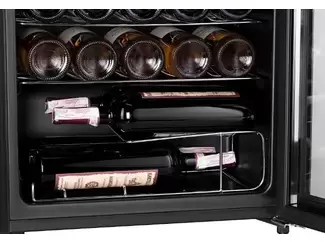 Дверца выполнена из стекла и покрыта специальным слоем, который защищает напитки от воздействия ультрафиолета. Материал корпуса — нержавеющая сталь, прочная и долговечная. Электронная система управления позволяет точно настраивать параметры и контролировать условия внутри. Все данные отображаются на дисплее: температура отслеживается встроенными датчиками и выводится на цифровой термометр. Встроенная подсветка делает коллекцию визуально привлекательной и помогает хорошо рассмотреть содержимое. Для размещения бутылок предусмотрено 14 полок.