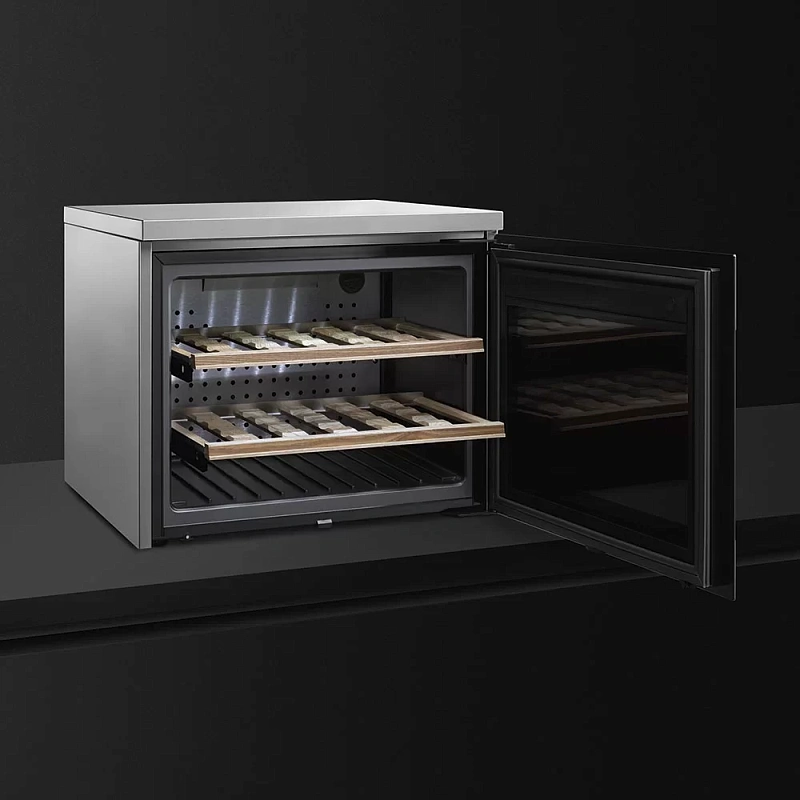 Небольшой винный холодильник от Smeg. В этой модели установлен малошумный компрессор с минимальной вибрацией и предусмотрено электронное регулирование температуры — всё это помогает сохранять напитки в идеальном состоянии.