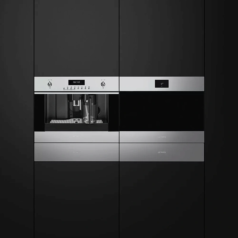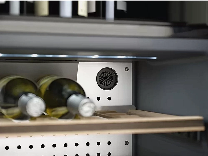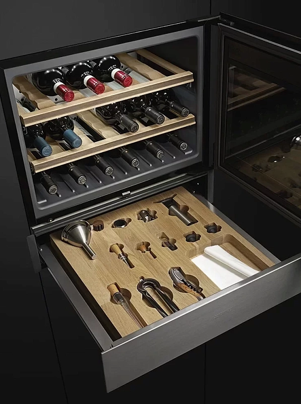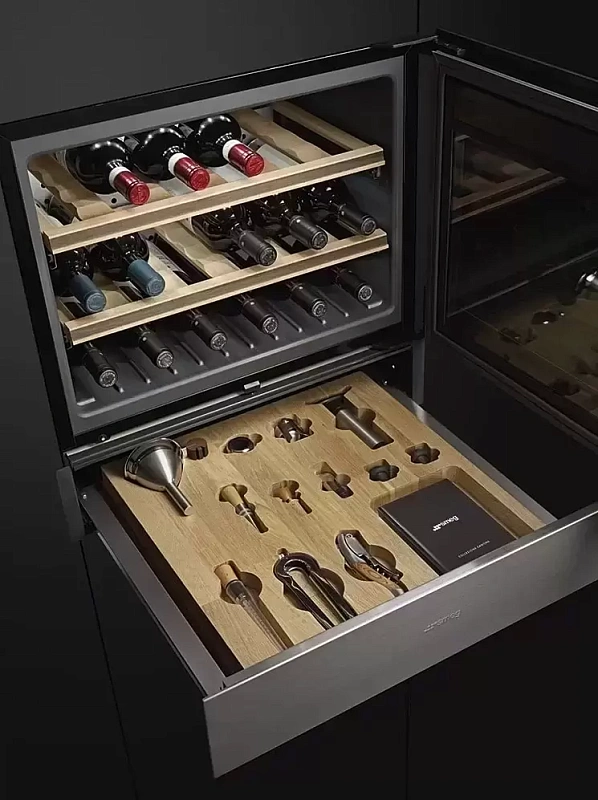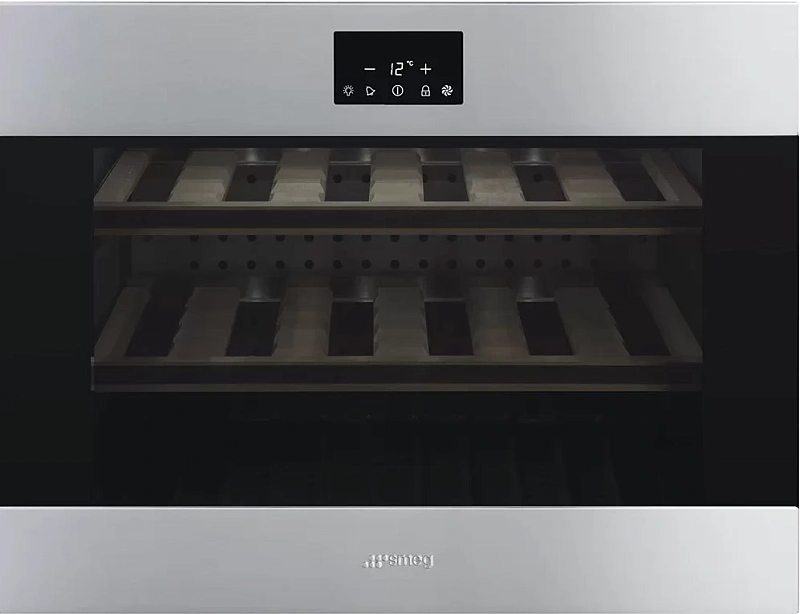 Встраиваемый винный холодильник от Smeg — компактный и удобный в использовании. Оснащён сенсорной панелью и LED-дисплеем, корпус выполнен из чёрного стекла с УФ-защитой. Температура регулируется электронно, что позволяет поддерживать идеальные условия для хранения вина.