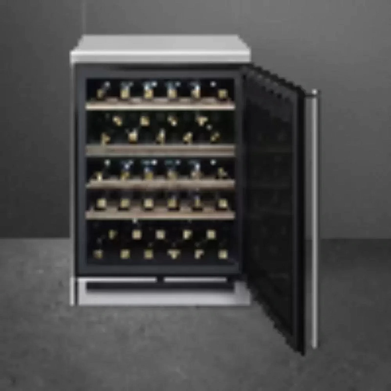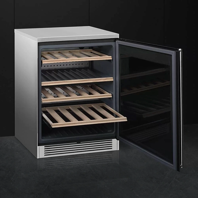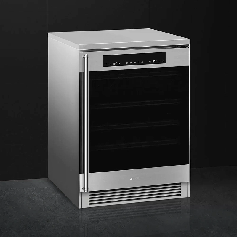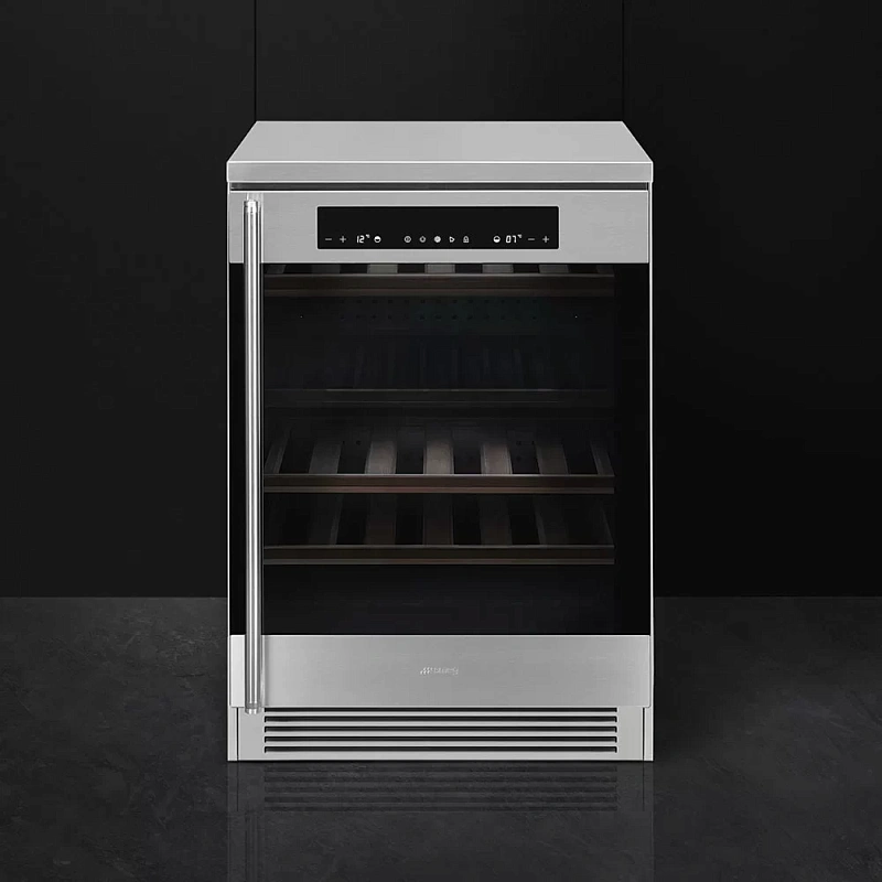 Smeg CVF338X — это отдельно стоящий винный холодильник, вмещающий до 38 бутылок объёмом по 0,75 литра. Корпус выполнен из нержавеющей стали и дополнительно обработан для защиты от следов пальцев. Управление осуществляется через сенсорную панель с дисплеем температуры. Внутреннее освещение обеспечено LED-подсветкой, а функция блокировки дверцы добавляет удобства и безопасности при использовании.