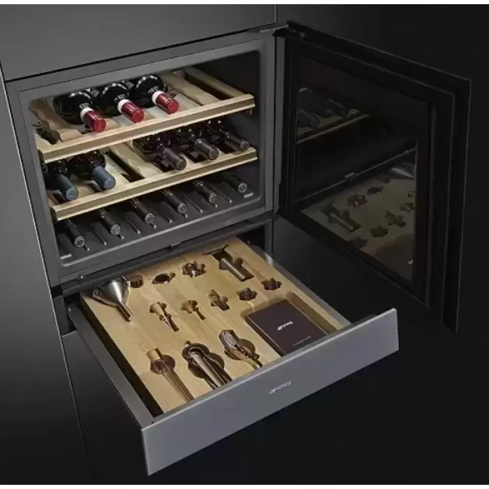 Винный шкаф Smeg CVI118RWS2 оснащён одной неподвижной и двумя регулируемыми по высоте полками, сделанными из дерева. Деревянный материал помогает снизить вибрации от компрессора, благодаря чему напитки меньше встряхиваются. Встроенная светодиодная подсветка даёт мягкий, рассеянный свет.