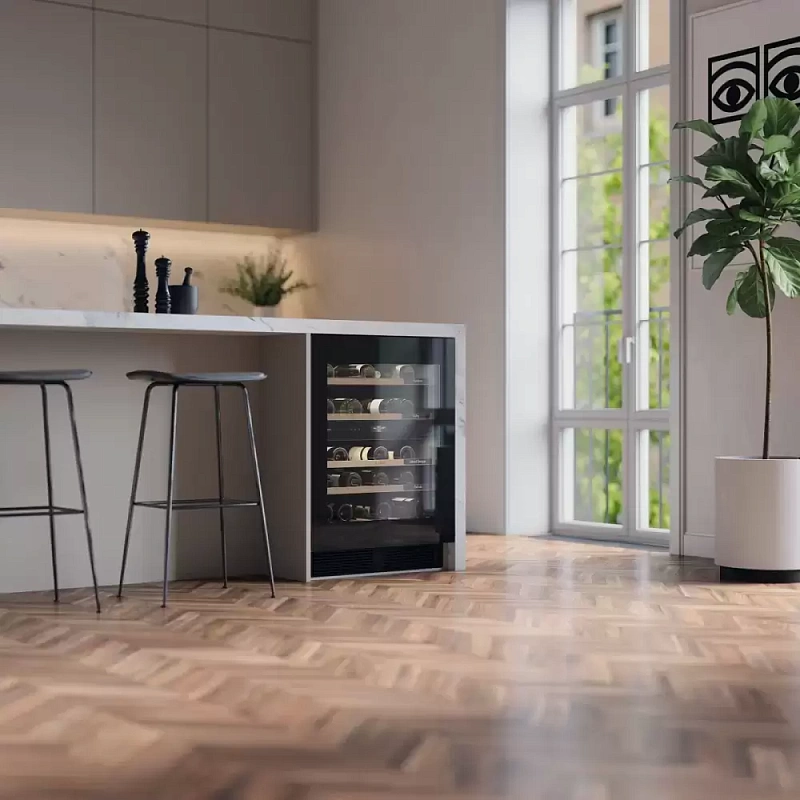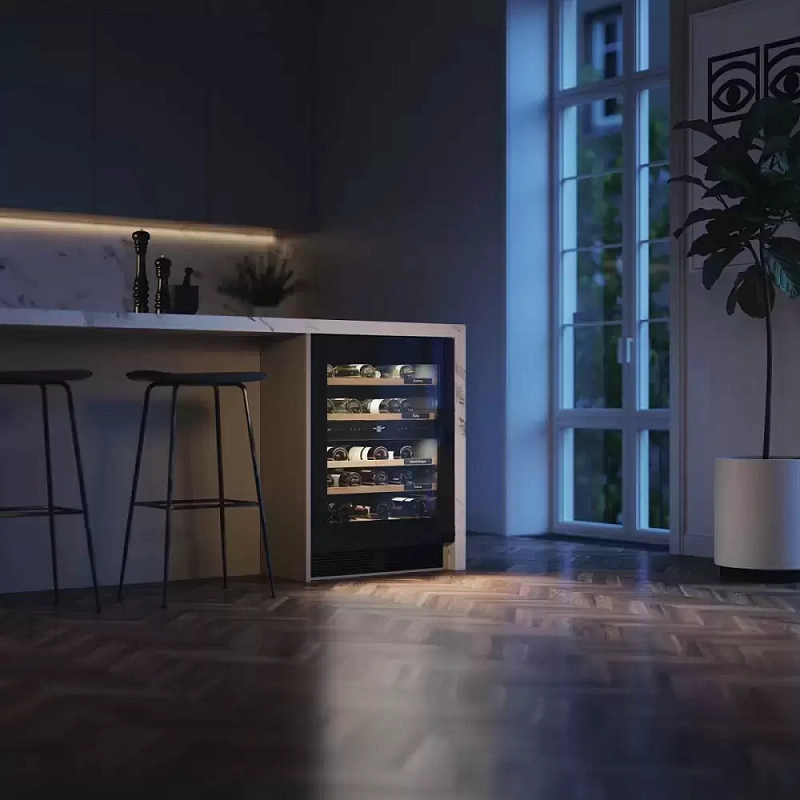 Все настройки легко регулируются через сенсорную панель — она позволяет задавать нужные параметры и отслеживать их изменения. Подсветка реализована светодиодами: они хорошо освещают внутреннее пространство, не создавая при этом лишнего тепла. В модели предусмотрены три выдвижные полки из термически обработанного бука — удобно доставать нужную бутылку. Максимальная вместимость — до 38 бутылок объемом 0,75 л.