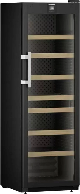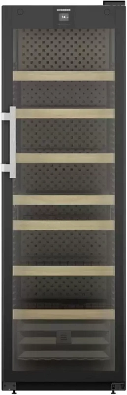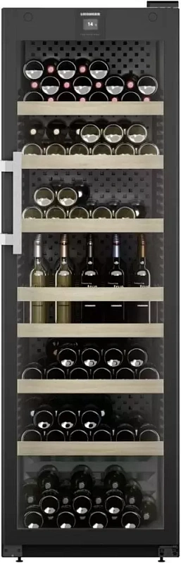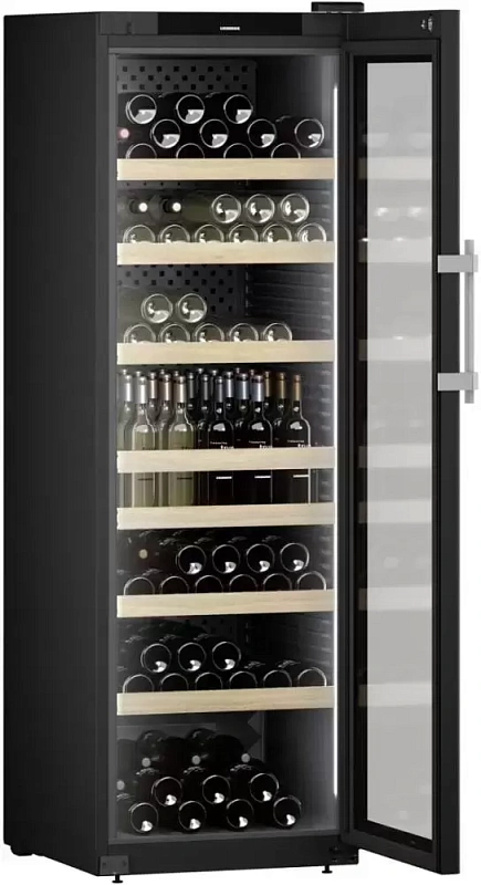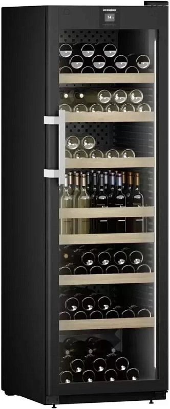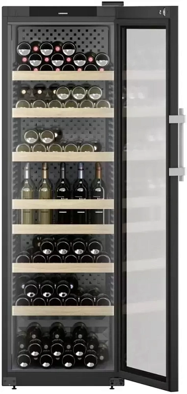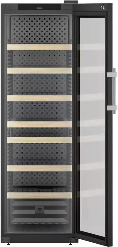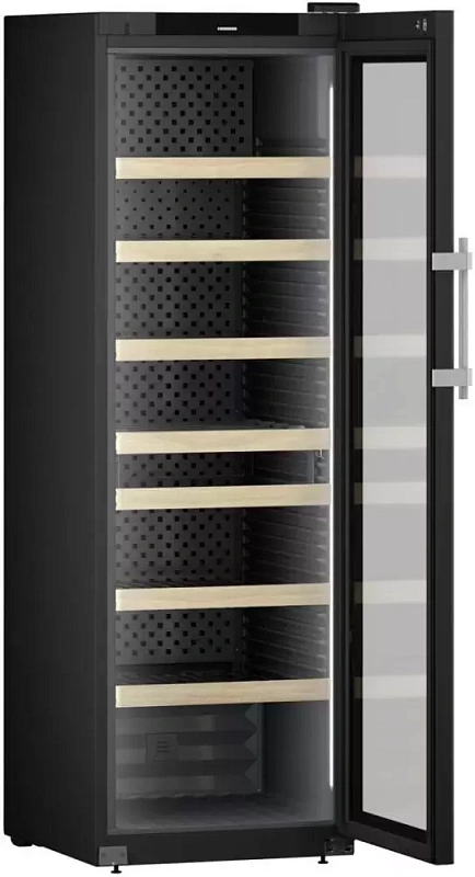 Винный шкаф Liebherr WFbli 5241 рассчитан на хранение до 188 бутылок по 0,75 литра каждая. Он имеет одну температурную зону — можно установить температуру охлаждения в пределах от 5 до 20 °C. Модель подходит для отдельной установки, что удобно, если есть кладовое помещение или винный погреб. Благодаря компрессорной системе охлаждения и автоматическому размораживанию внутри поддерживается стабильный климат, а наледь не образуется — уход за устройством нужен минимальный. Дверца из тонированного стекла защищает напитки от ультрафиолета, который может негативно сказаться на их вкусе и аромате. При необходимости дверь можно перевесить на другую сторону — это удобно при выборе места установки. Корпус шкафа окрашен в чёрный цвет. Электронная панель управления с дисплеем помогает легко настроить нужную температуру и следить за состоянием внутри камеры. Встроенное освещение позволяет хорошо видеть все бутылки, а семь полок обеспечивают удобное размещение коллекции. Система вентиляции равномерно распределяет воздух и предотвращает появление запахов или сырости. Для дополнительного удобства предусмотрены такие функции, как сигнал открытой двери для предотвращения потери холода и блокировка панели управления от случайных изменений настроек.