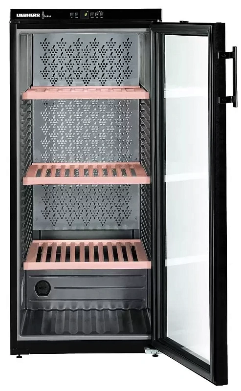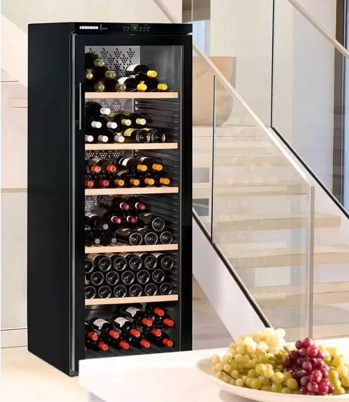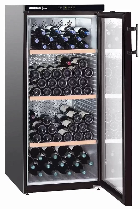 Винный шкаф Liebherr WKb 3212 Vinothek — австрийская модель, предназначенная для хранения до 164 бутылок вина. Температурный режим варьируется от +5°C до +20°C, что позволяет поддерживать нужные условия как для белых, так и для красных и розовых вин. Корпус шкафа выполнен из стали с чёрным покрытием. Дверца оборудована двойным стеклопакетом с защитным слоем, который не пропускает солнечный свет. Петли установлены с правой стороны, но при необходимости их можно переставить на левую.