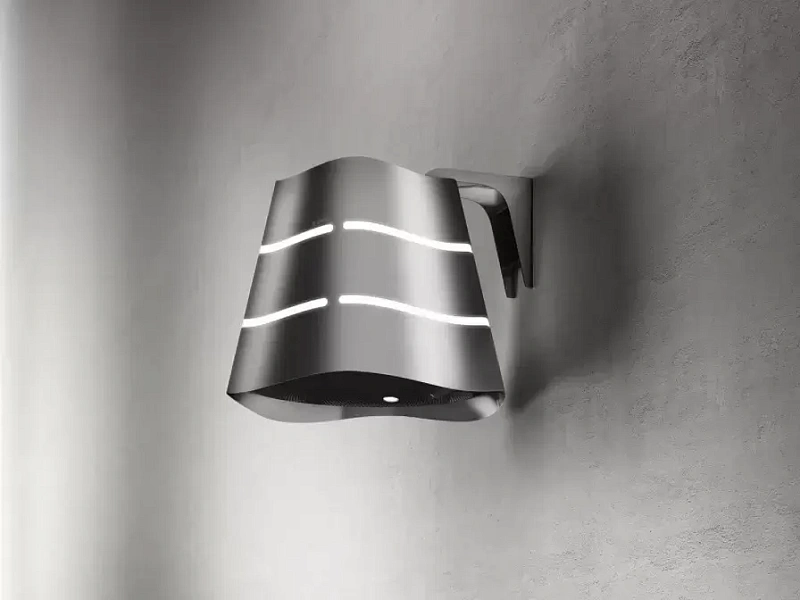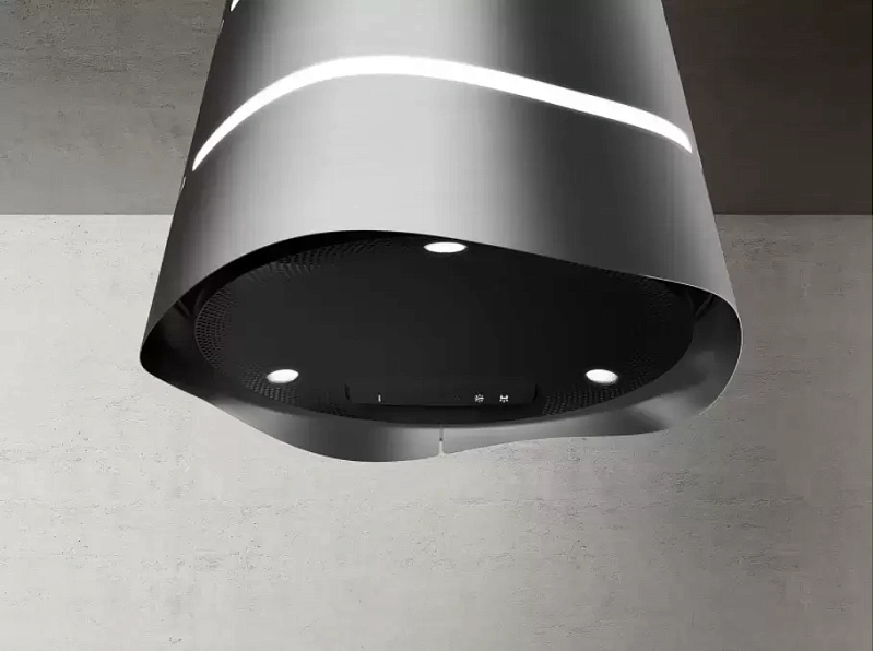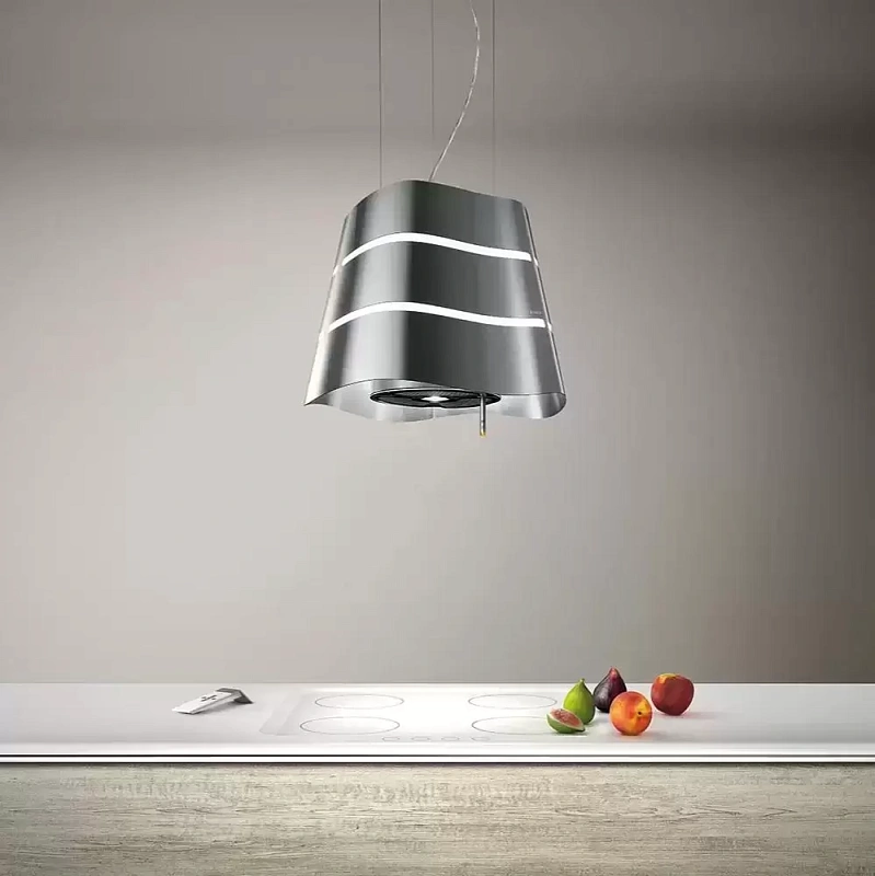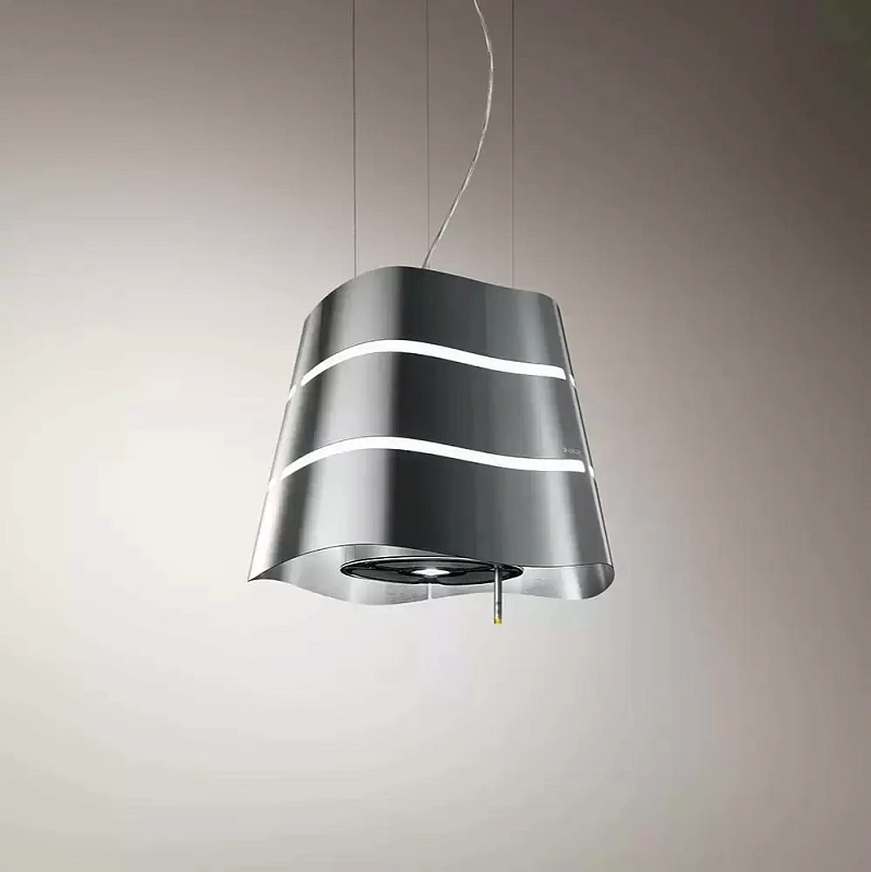 Подвесная вытяжка с галогеновой подсветкой способна выполнять не только свою основную функцию, но и служить дополнительным источником света в кухонном пространстве. Её дизайн отличается лаконичностью: оригинальная форма в сочетании с благородным оттенком нержавеющей стали хорошо вписывается в современный интерьер. Благодаря компактности и установке непосредственно на потолок, вытяжка смотрится легко и не перегружает обстановку.