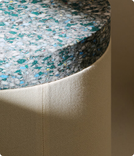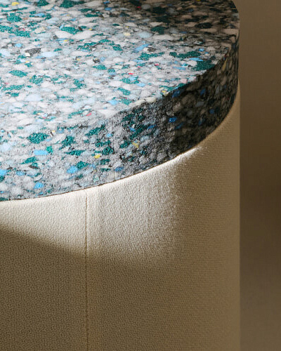 Переработанные ткани из коллекции BENU Recycled от Fischbacher 1819 сшиты в многослойные текстильные мембраны, каждая складка которых хранит следы предыдущего использования и тщательной переработки. Мастерская DS DER SATTLER объединяет пену и ткани BENU, привнося в проект традиционное швейцарское мастерство, внимание к деталям и высокую точность исполнения.